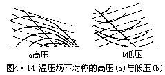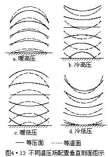 由于温压场配置重合,所以该系统中水平面上等温线与等压线是基本平行的。系统中包括暖性高压、冷性低压和暖性低压、冷性高压,图4•13。