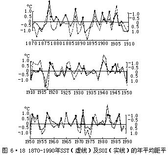 图6·17赤道太平洋热结构对海面风场变化的响应 a.平均状况 b.强信风 c.信风张驰 与厄尔尼诺事件密切相关的环流还有南方涛动(Southern Oscillation,简作SO)、沃克(Walker)环流和哈德莱(Hadley)环流。南方涛动是指南太平洋副热带高压与印度洋赤道低压这两大活动中心之间气压变化的负相关关系。即南太平洋副热带高压比常年增高(降低)时,印度洋赤道低压就比常年降低(增高),两者气压变化有“跷跷板”现象,称之为涛动。为了定量地表示涛动振幅的大小,不少学者采用南太平洋塔希堤岛(143°05'W,17°53'S)的海平面气压(代表南太平洋副热带高压)与同时期澳大利亚北部的达尔文港(130°59'E,12°20'S)的海平面气压(代表印度洋赤道低压)差值,经过一定的数学处理来计算南方涛动指数(SOI),将历年赤道东太平洋海面水温SST(指在纬度0°—10°S,经度180°W向东至90°W)与同时期南方涛动指数SOI进行对比,发现厄尔尼诺/南方涛动(合称为ENSO)事件的主要特征是当赤道东太平洋海水温度(SST)出现异常高位相(增暖)时,南方涛动指数SOI却出现异常低位相(塔希堤岛气压与达尔文气压差值减小)。图6·18给出1870—1990年的SST(0°—10°S,90°—180°W)与SOI的年平均距平曲线,为了便于比较,图中SOI的坐标向上为负,以适应两者的负相关。关于赤道东太平洋海水温度SST达到怎样的正距平,才算厄尔尼诺出现,目前尚无公认的统一标准,但大体上连续三个月SST正距平在0.5℃以上或其季距平达到0.5℃以上,即可认为出现一次厄尔尼诺事件,达到上述数值的负距平时,则为反厄尔尼诺事件。 厄尔尼诺/南方涛动现象是低纬度海气相互作用的强信号,近年观测研究表明,在低纬度太平洋上不仅在南半球存在着以180°日界线为零线的东西气压的反相振荡,在北太平洋亦有类似的振荡称为“北方涛动”(其强度比南方涛动小),可总称为“低纬度涛动”。它是由两种基本状态和其间的过渡状态所组成(图6·19)。在涛动的低指数时期(图6·19a),赤道低气压主体减弱,但前端向东伸展,此时南、北太平洋上副热带高压减弱,并向较高纬度移动,其结果必然导致信风减弱,赤道西风发展,在这样的大气环流条件下,有利于赤道西太平洋暖水的向东扩展和输送,同时赤道东太平洋冷水上翻的现象亦相应减弱乃至停止,造成中、东太平洋海面水温升高,出现厄尔尼诺事件。在海面高水温作用下,低层大气湿度加大,湿不稳定得以发展,因此沃克环流发生变化,其上升分支向东移,西太平洋对流减弱,中、东太平洋对流发展。原先的赤道太平洋干旱带变为多雨带,印度洋和西太平洋的雨量却大为减少。