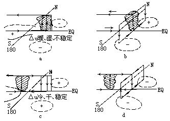 如上所述,环流因子在气候形成中起着重要作用。当环流形势在某些年份出现异常变化时,就会直接影响某些时期内的天气和气候,出现异常。近年来频繁出现的厄尔尼诺/南方涛动(ENSO)就是一个显著的实例。 厄尔尼诺一词源出于西班牙文“El Nino”,原意是“圣婴”。最初用来表示在有的年份圣诞节前后,沿南美秘鲁和厄瓜多尔附近太平洋海岸出现的一支暖洋流,后来科学上用此词表示在南美西海岸(秘鲁和厄瓜多尔附近)延伸至赤道东太平洋向西至日界线(180°)附近的海面温度异常增暖现象。 在常年,此区域东向信风盛行,在平均风速下,沿赤道太平洋海平面高度呈西高东低的形势。西太平洋斜温层深度约200m,东太平洋仅50m左右,这种结构与西暖东冷的平均海温分布相适应(图6·17a)。但是在东风异常加强的情况下(图6·17b),赤道表面东风应力把表层暖水向西太平洋输送,在西太平洋堆积,那里的海平面就不断抬升,积累大量位能,斜温层加深。而东太平洋在离岸风的作用下,表层海水产生强的离岸漂流,造成这里持续的海水质量辐散,海平面降低,次层冷海水上翻,导致这里成为更冷的冷水带。此冷水带有丰富的营养盐分,使得浮游生物大量繁殖,为鱼类提供充足的饵料,鱼类又为鸟类提供丰盛的食物,所以这里鸟类甚多,鸟粪堆积甚厚,成为当地一项重要资源。在冷水带上,气温高于水温,空气层结稳定,对流不易发展,雨量偏少,气候干旱。可是每隔数年,东向信风发生张驰(即减弱),此处的冷水上翻现象消失,并使西太平洋原先积累的位能释放,表层暖水向东回流,导致赤道东太平洋海平面升高,海面水温增暖,秘鲁、厄瓜多尔沿岸由冷洋流转变为暖洋流,海水温度出现正距平(图6·17c),下层海水中的无机盐类不再涌向海面,导致当地的浮游生物和鱼类大量死亡,大批鸟类亦因饥饿而死,形成一种严重灾害,与此同时,原来的干旱气候突然转变为多雨气候,甚至造成洪水泛滥,这就称为厄尔尼诺事件。