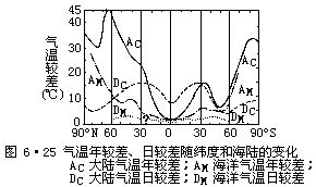 由于海陆分布对气候形成的巨大作用,使得在同一纬度带内,在海洋条件下和在大陆条件下的气候具有显著差异。前者称为海洋性气候,后者称为大陆性气候。区别海洋性气候与大陆性气候的指标很多,最主要表现在气温和降水两方面。 (一)气温指标 海洋性气候与大陆性气候在气温上的标志一般用气温日较差、气温年较差、年温相时、春秋温差值和大陆度等几个指标表示,气温较差还和所在地纬度有关(图6·25)。
