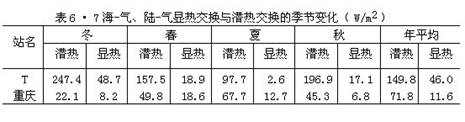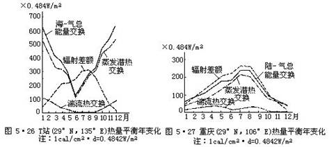 在赤道附近AC与AM都很小,只有DC与DM差别显著。在南半球因大陆面积小,只有在中纬度AC、AM间和DC、DCM间的差值都很大,这和海陆分布的形势关系十分密切。 海洋上气温年较差比大陆上小,可从海-气热交换与陆-气热交换的年变程上得到最好的说明。图6·26和6·27分别表示太平洋上T站(29°N,135°E)、重庆(29°N,106°E)的热量平衡年变化,这两个站的纬度相同,天文辐射是相等的。从辐射差额来讲,T站所获得的正值净辐射比重庆多。从海-气的总能量交换看来,是冬季多、夏季少。无论是显热交换还是潜热交换,年变化曲线的起伏形势都与辐射差额相反。而重庆这两条曲线的起伏形势是相同的。再看表6·7,太平洋上T站夏季供给空气的显热只有2.6W/m2,而重庆地面供给空气的显热却有12.7W/m2,相当于T站的5倍。显热是能直接使空气增温的,这就使得重庆夏季的气温比T站高。而冬季则相反,T站提供的显热有48.7W/m2,而重庆为8.2W/m2。这必然使得重庆冬季的气温比T站低得多。相对于重庆来说,T站是冬暖夏凉,气温的年较差小。重庆则夏热冬寒,气温年较差大。 海洋上云量一般比大陆上多,风速较陆上大,这也能减小海上气温的日较差和年较差。 再以中纬度西风带的亚欧大陆为例,凡伦西亚在爱尔兰西岸,有大西洋暖流经过,终年受海风影响,盛行海洋气团,具有典型的海洋性气候。沿52°N由西向东,海洋气团在大陆上逐渐变性,到了伊尔库次克就具有大陆性气候的特点,从表6·8可见: