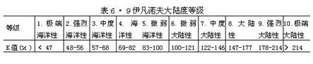 K>100%,则为大陆性气候,百分数愈大,大陆性愈强;反之,如分子值小于分母值,得出K值<100%,则为海洋性气候,百分数愈小,海洋性愈强。伊凡诺夫根据该式求出的K值把大陆度分为以下10个等级(表6·9)