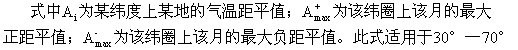 波罗佐娃 应用1月、7月气温对纬圈距平值来分别计算该两月的大陆度。因为气温距平基本上是由于海洋和大陆以及海陆间热力相互作用所造成的,各个季节的不同温度差异可以引起海陆间不同的环流特征。环流情况不同,海陆间相互作用的强度也不相同,因此按季节计算的气温距平,特别是冬夏两季的气温距平来表征大陆度更有实际意义。波罗佐娃以KⅠ和KⅦ分别表示1月和7月的大陆度,其计算式如下