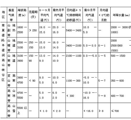 在高山地带随着高度的增加,空气愈来愈稀薄,空气组成中的二氧化碳、水汽、微尘和大气中污染物质等逐渐减少,气压降低,风力增大,日照增强,气温降低。在一定坡向,一定高度范围内,降水量随高度而加大,过了最大降水带之后,降水又复随高度而减小。由于上述诸要素的垂直变化,遂导致高山气候具有明显的垂直地带性,这种垂直地带性又因高山所在地的纬度和区域气候条件而有所不同,这里举例加以说明。 ![]()