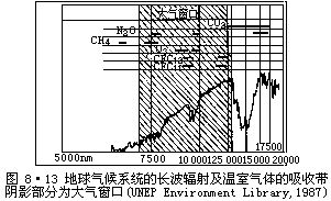 大气中有一些微量气体和痕量气体对太阳辐射是透明的,但对地气系统中的长波辐射(约相当于285K黑体辐射)却有相当强的吸收能力,对地面气候起到类似温室的作用,故称温室气体。图8•13给出地气系统的长波辐射及影响气候变化的主要温室气体的吸收带,图中所列出的CO2、CH4、N2O、O3等成分是大气中所固有的,CFC11和CFC12是由近代人类活动所引起的。这些成分在大气中总的含量虽很小,但它们的温室效应,对地气系统的辐射能收支和能量平衡却起着极重要的作用。这些成分浓度的变化必然会对地球气候系统造成明显拢动,引起全球气候的变化。