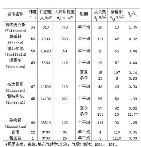 随着工业、交通运输和城市化的发展,世界能量的消耗迅速增长,仅1970年全世界消耗的能量就相当于燃烧了75亿t煤,放出25×1010J的热量。其中在工业生产、机动车运输中有大量废热排出,居民炉灶和空调以及人、畜的新陈代谢等亦放出一定的热量,这些“人为热”像火炉一样直接增暖大气。目前如果将人为热平均到整个大陆;等于在每平方米的土地上放出0.05W的热量。从数值上讲,它和整个地球平均从太阳获得的净辐射热相比是微不足道的,但是由于人为热的释放集中于某些人口稠密、工商业发达的大城市,其局地增暖的效应就相当显著。如表8•8所示,在高纬度城市如费尔班克斯、莫斯科等,其年平均人为热(QF)的排放量大于太阳净辐射;中纬度城市如蒙特利尔、曼哈顿等,因人均用能量大,其年平均人为热QF的排放量亦大于RG。特别是蒙特利尔冬季因空调取暖耗能量特大,其人为热竟相当于太阳净辐射的11倍以上。但是像热带的香港,赤道带的新加坡,其人为热的排放量与太阳净辐射相比就微乎其微了。